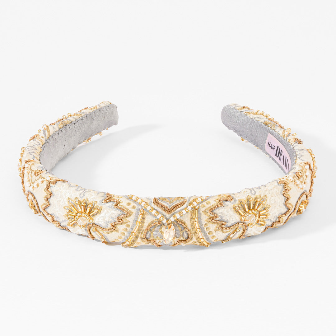 A handcrafted puff hairband with ivory base and intricate gold threadwork for an understated luxury look.