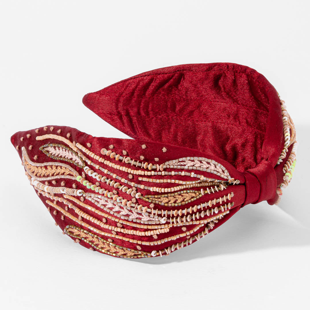 A luxurious blend of maroon satin and luminous embroidery, this headband pairs pearls, sequins, and golden accents in wave-like patterns, perfect for festive evenings and statement styling.