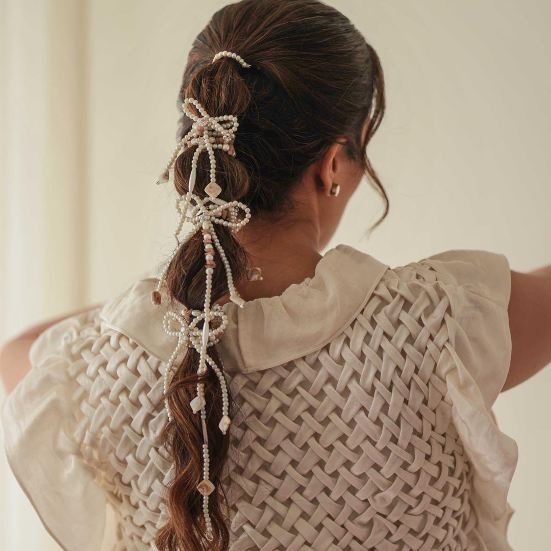 Elevate your braid game with the Diva Parandi, a stunning fusion of fashion and contemporary flair. Handcrafted with shimmering crystals and pearls, this parandi has bows adorned in it which adds a touch of fun to your look.