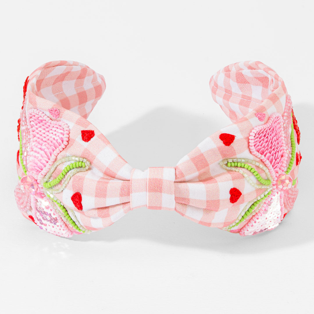 This pink gingham knotted headband celebrates sweetness and style with its bead-embroidered cherries, a bow and heart motifs.