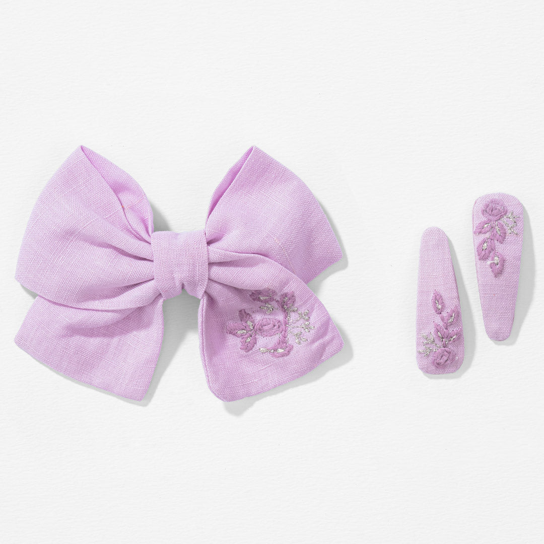 A set of 2 soft pastel lilac hair accessories comes with a large bow and 2 matching hair clips.