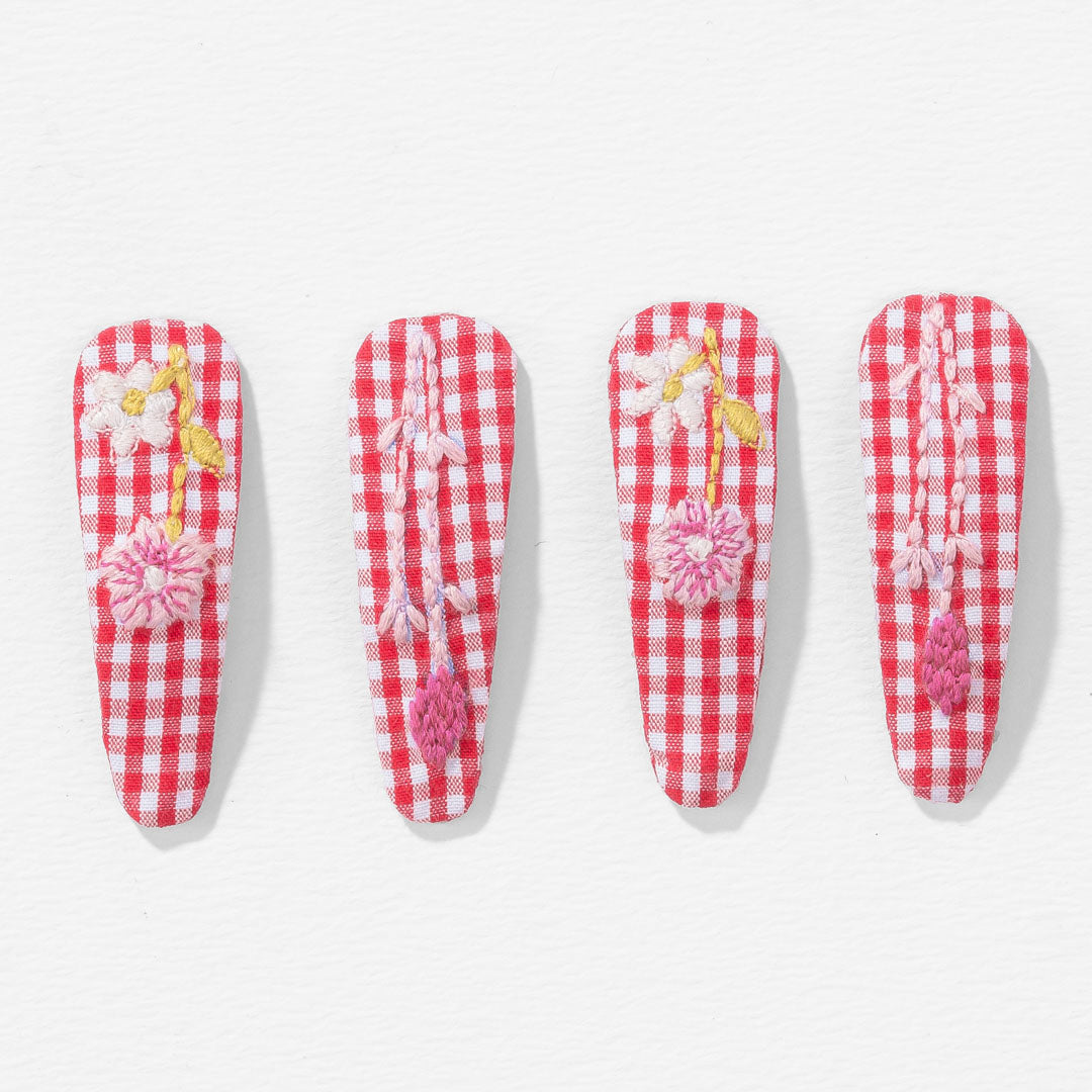 A set of 4 hair clips featuring delicate floral embroidery on red ghingham printed fabric.