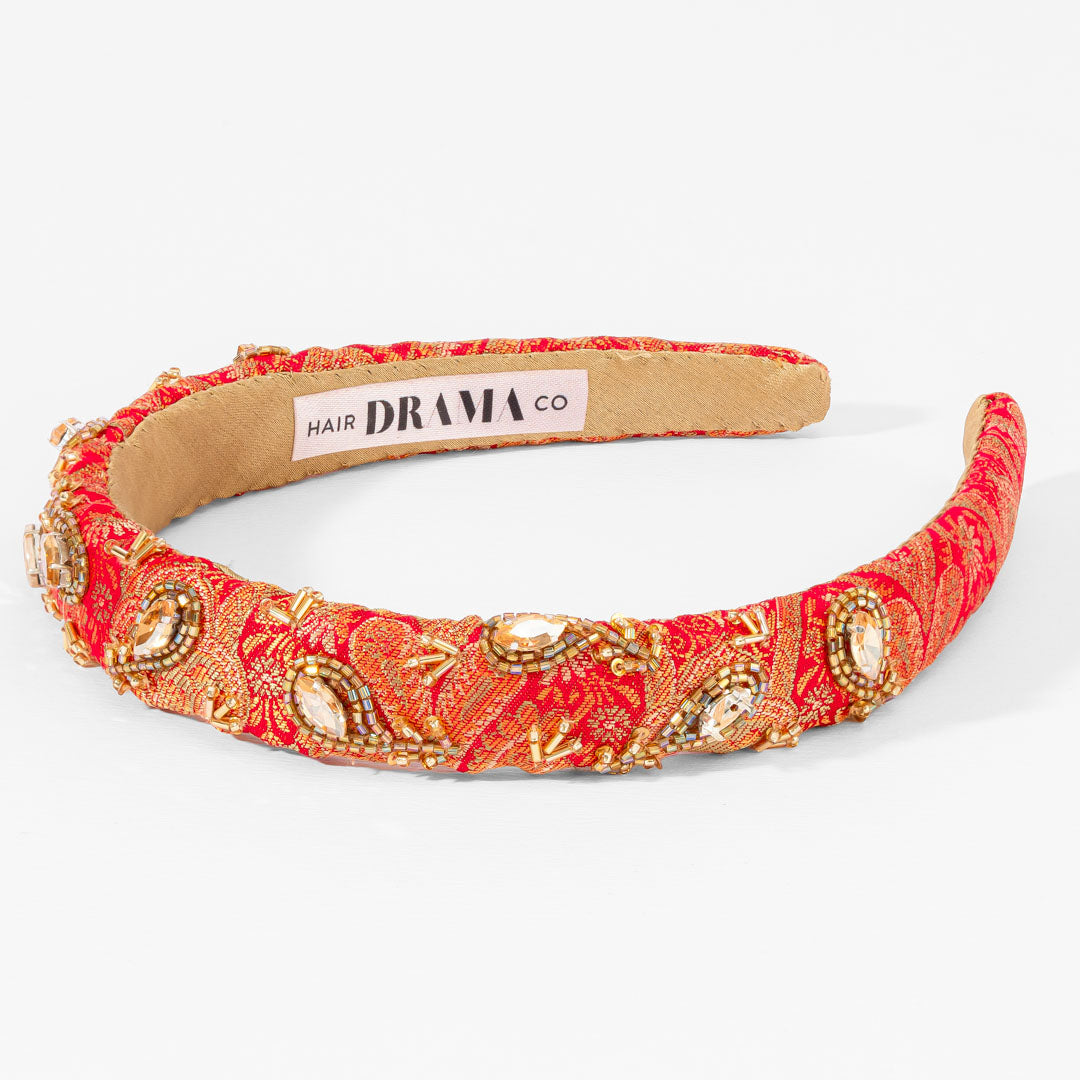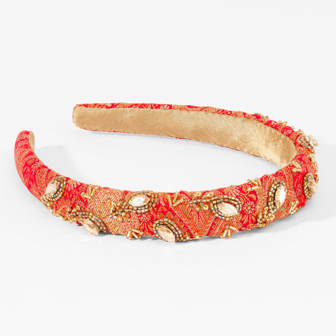 A striking red puff hairband highlighted with golden embroidery and stone embellishments.