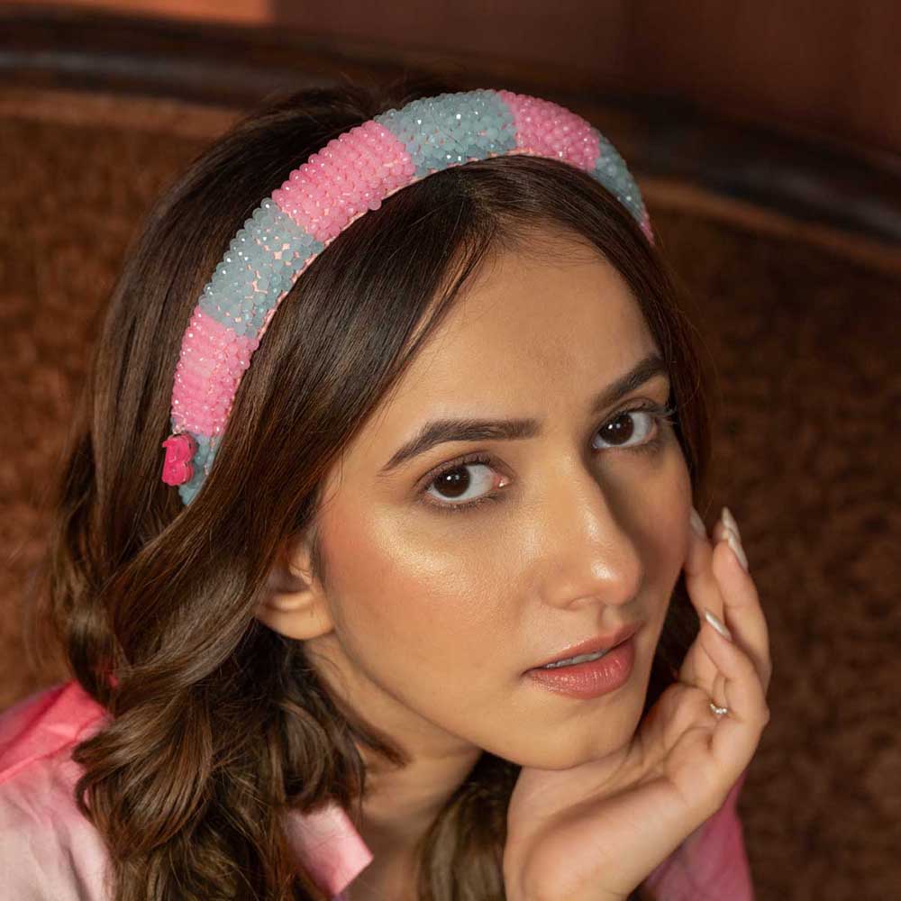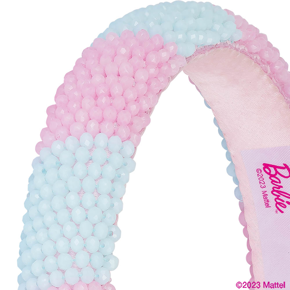 - Glamour com um toque Barbie! Esta tiara bordada combina descontração e sofisticação. Feita em cetim de seda e adornada com cristais cor-de-rosa e azuis, este acessório de cabelo é perfeito para si!
