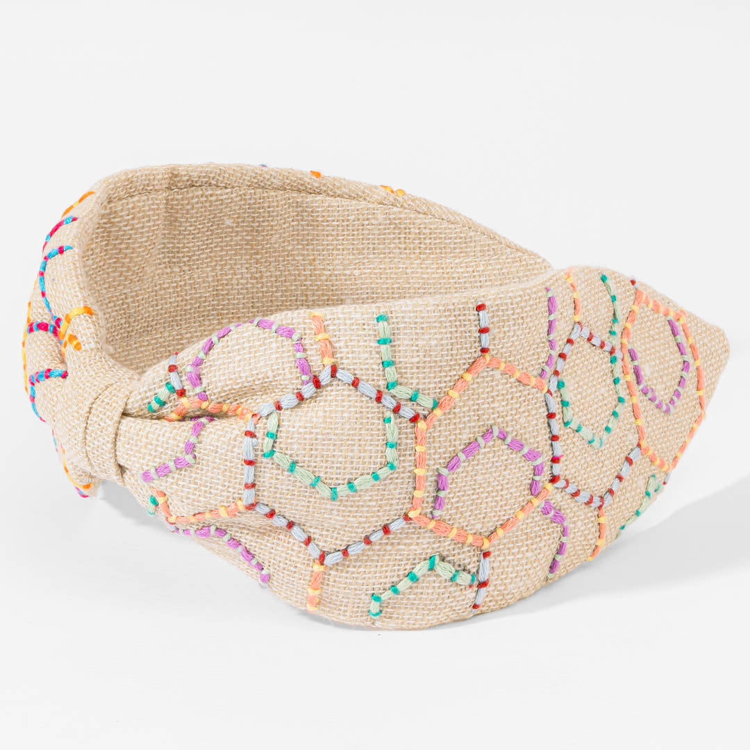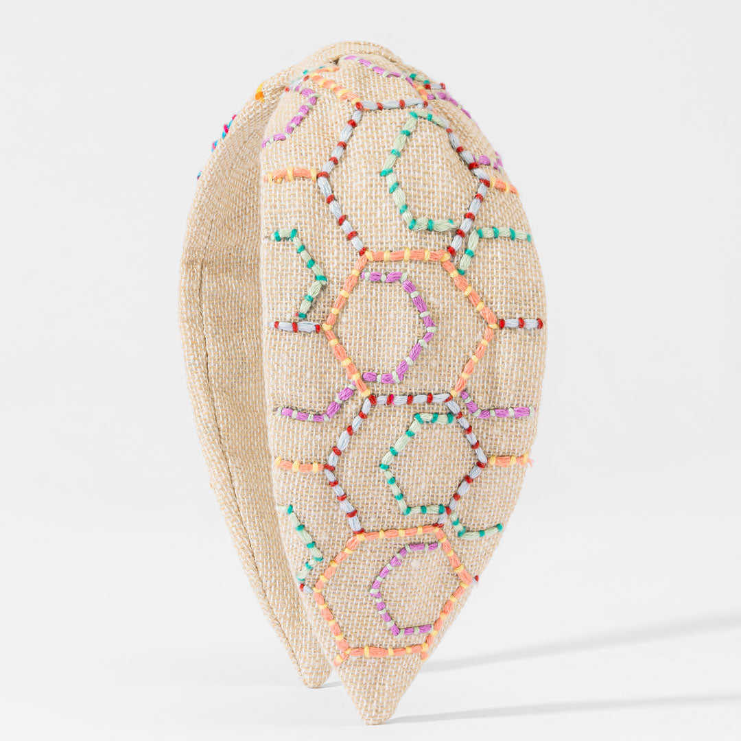 Com um toque moderno e artesanal, esta fita para o cabelo combina o charme rústico da juta com hexágonos bordados à mão em fios vibrantes — perfeita para dar um toque de cor aos looks do dia a dia.