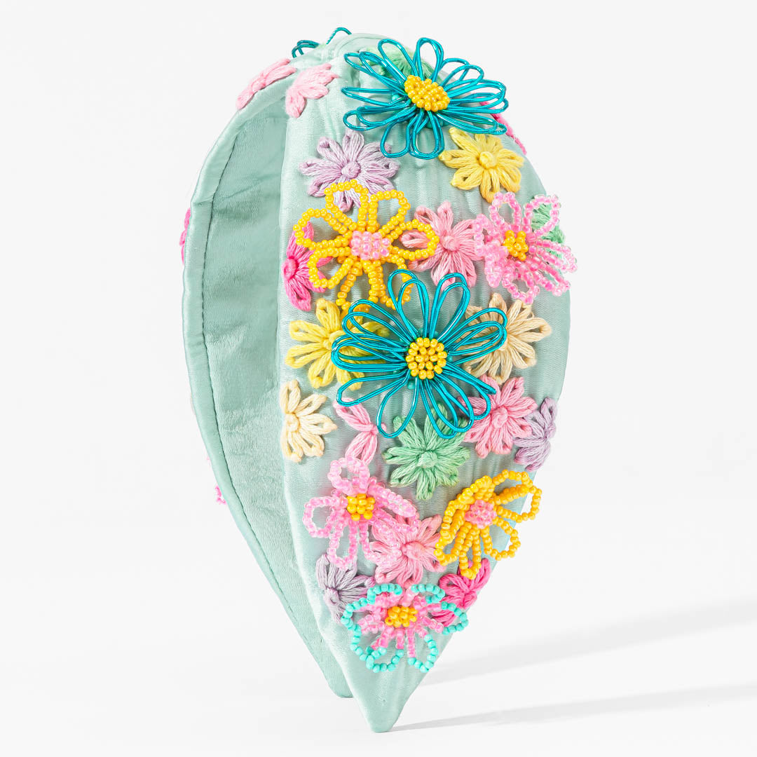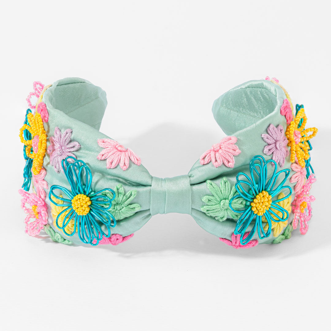 Esta fita para o cabelo em cetim verde-mar, com nó, exibe um bordado floral multicolorido em fios de seda e missangas. Uma peça artesanal que traz uma elegância divertida tanto para o dia a dia como para as noites festivas.