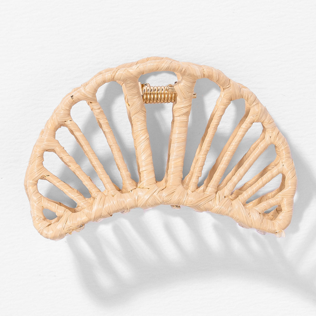 Um acessório essencial para o dia a dia, um gancho de cabelo em forma de garra de metal envolto em fios de ráfia creme, criado para dar um toque de cor a qualquer penteado.
