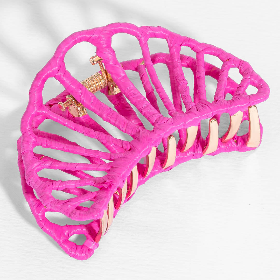 Um acessório essencial para o dia a dia, um gancho de cabelo em forma de garra de metal envolto em fios de ráfia fúcsia, criado para dar um toque vibrante de cor a qualquer penteado.