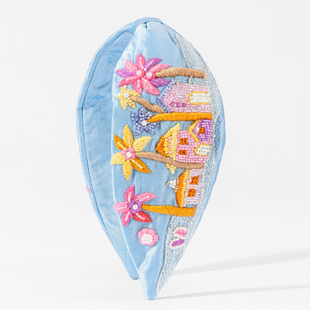 Esta faixa de cabelo azul com nós apresenta bordados de casas, palmeiras e flores inspirados na paisagem urbana de Omã.
