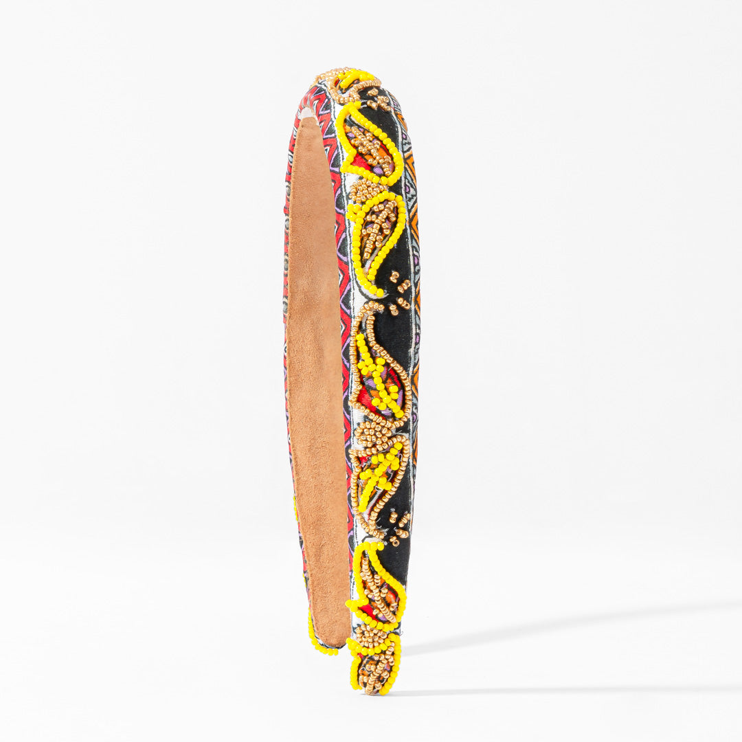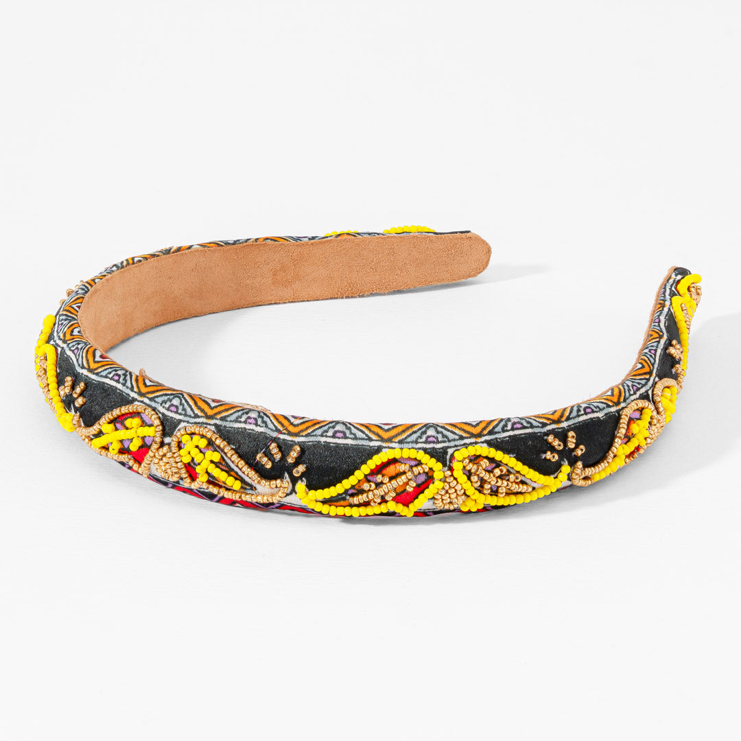 Inspirada nos motivos indianos clássicos, esta fita de cabelo bordada com padrão paisley combina um intrincado trabalho de missangas com cores vibrantes, perfeita para um look festivo e marcante.