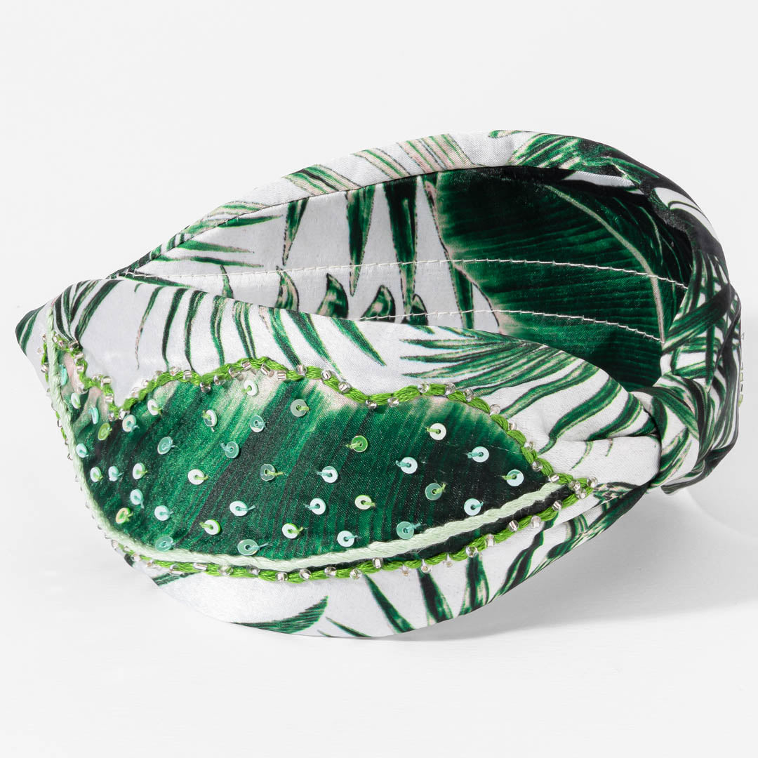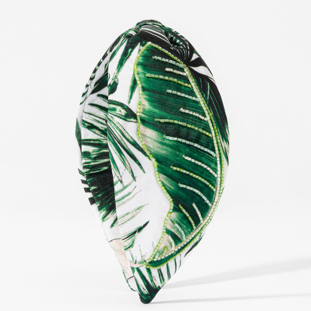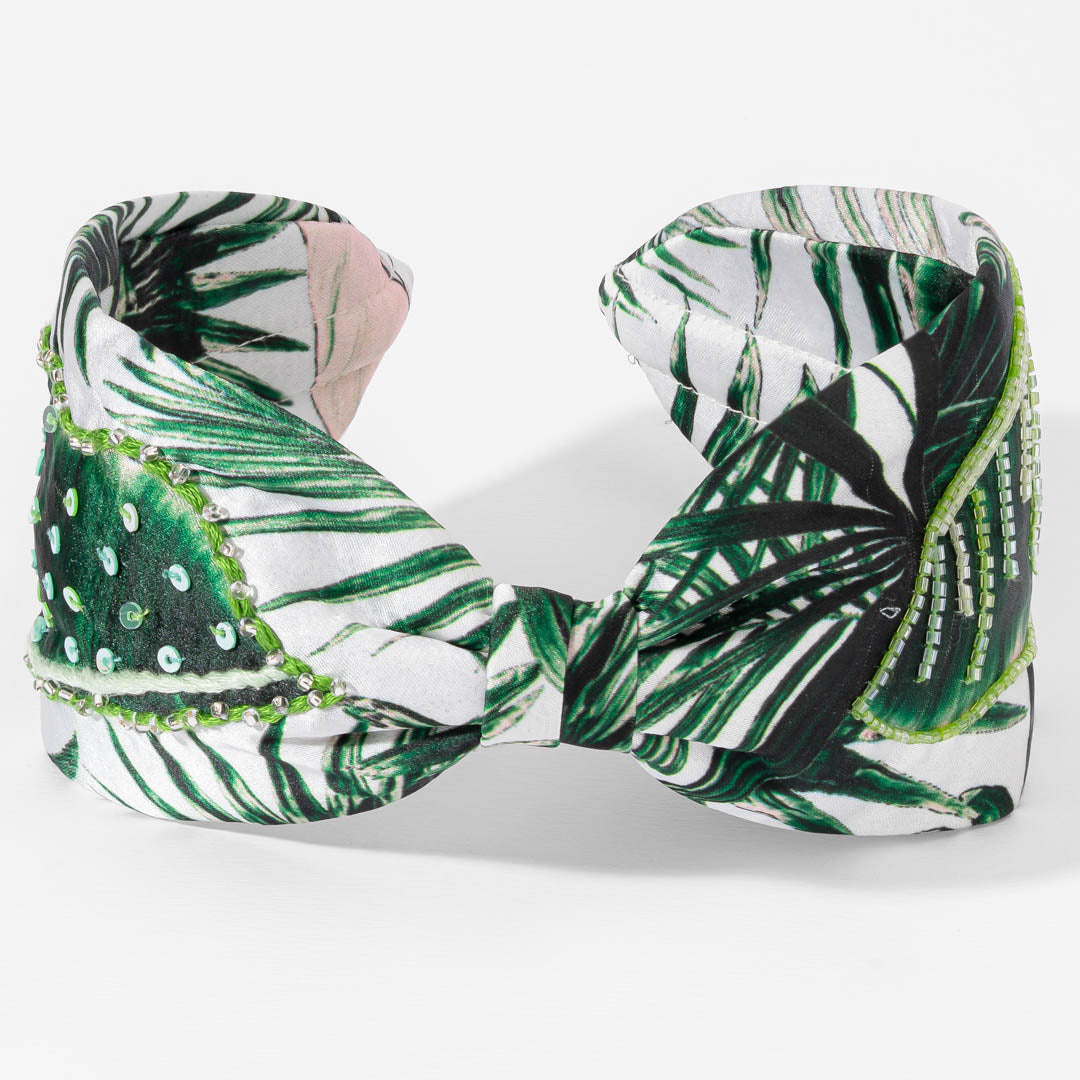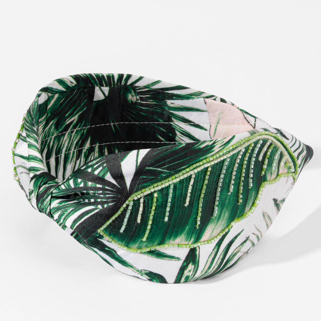Inspirada na exuberância dos trópicos, esta fita de cabelo em cetim com nó apresenta estampados de palmeiras e folhas acentuadas por bordados em tule verde — perfeita para looks de férias e festas de verão.