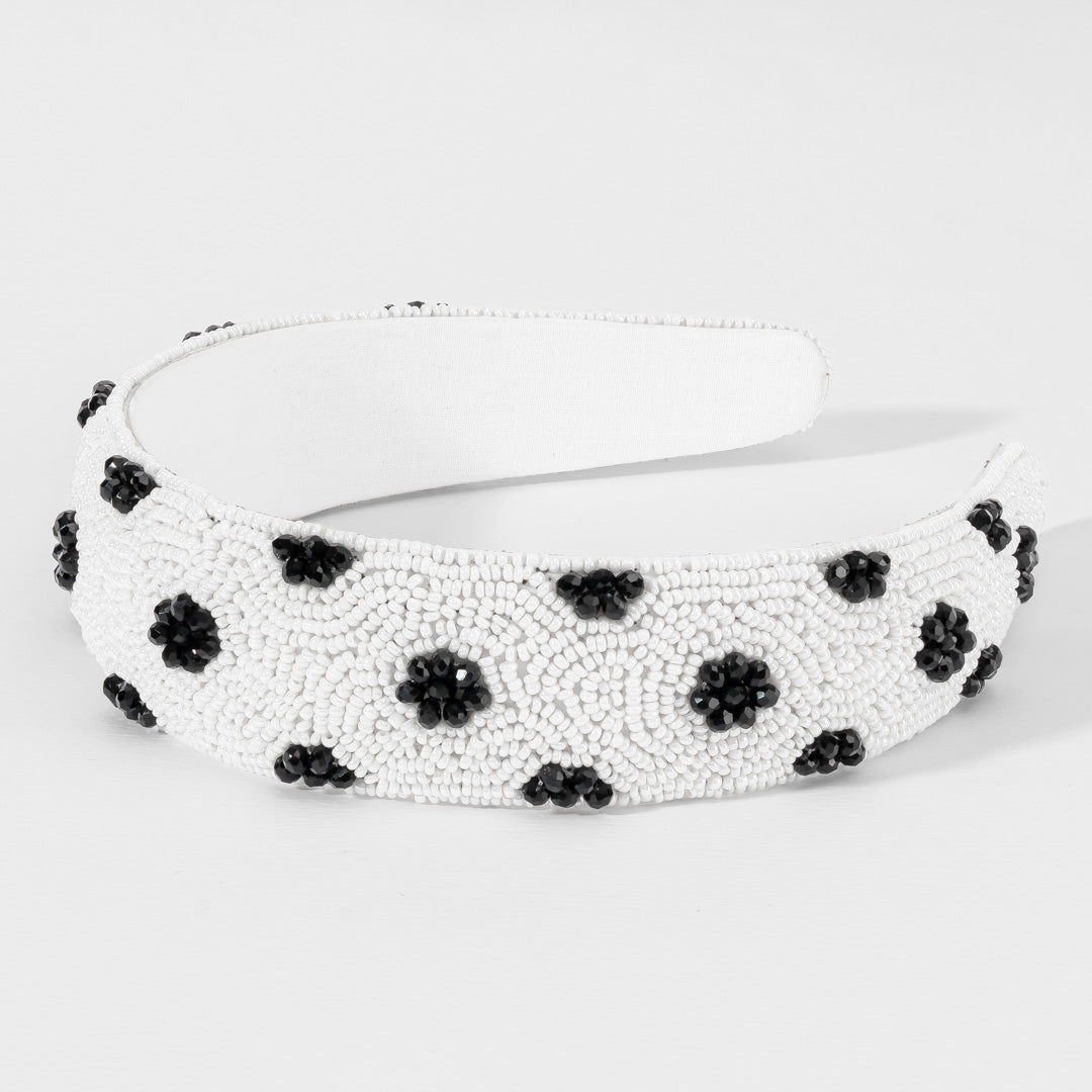 Uma tiara branca com detalhes em relevo, bordada à mão com missangas pretas e brancas num padrão clássico de bolinhas.
