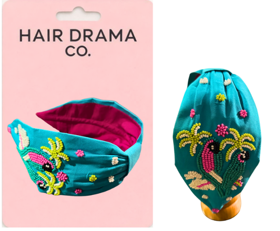 Statement summer headband, brought to life with vibrant hand embroidery and bold tropical motifs. Crafted on a rich teal base with a contrasting inner lining, it adds instant colour and character to any look.