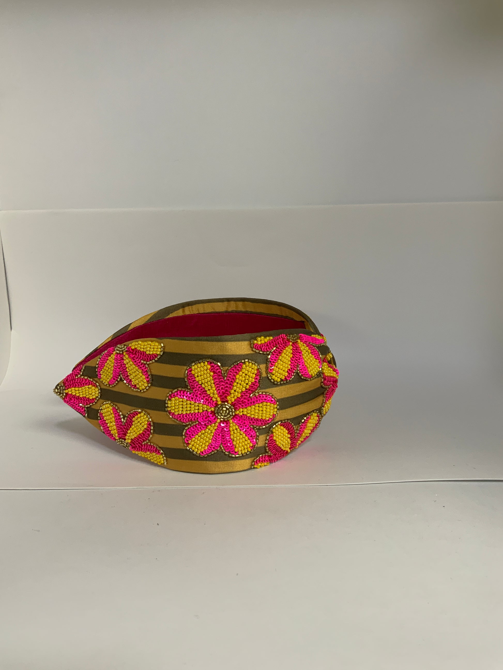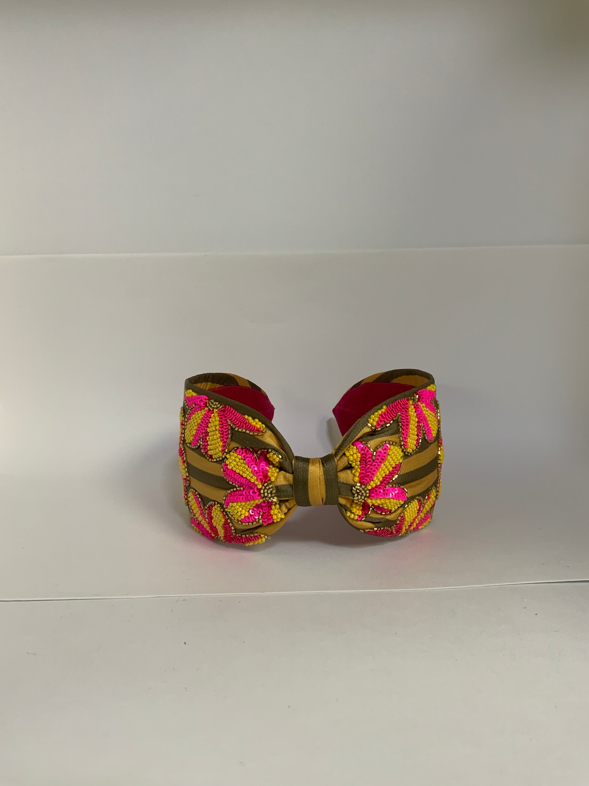 Hand-embellished florals meet a structured knot for a headband that feels festive, artisanal, and statement-making in every way.